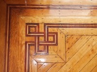A small knot in the front hall. Knot width is 6". Band width is 3/4". Inner square is 1". Slats surrounding bands are 2" wide. Inner field is diagonal fingerblock with four 2" wide slats in an 8" square.