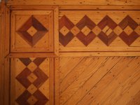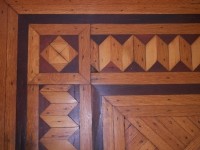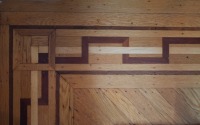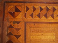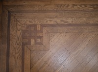 The pattern border is 4" wide. Surrounded by 1/2" oak, 1/2" mahogany and 1" oak. Inner field is diagonal fingerblock with 2" slats in an 8" square.