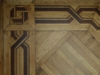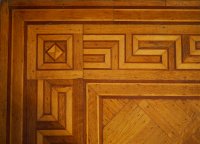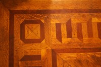 Only two woods: mahogany and oak. I would jazz this up with a 1/4" feature strip of mahogany. Field is 8" square with 6 strips [they are not the same width]. The field parquet is straight, as there are no diagonals in the border. See