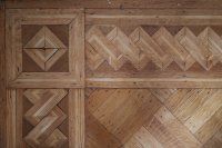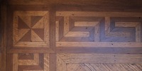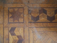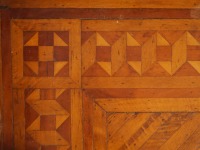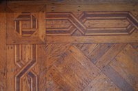 It looks newer than 1898. Could be a refloor. Lots of 30/120 angles. Maple strips are 1/4" and mahogany center is 1". Overall pattern width is 7-5/8". I didn't think to get the distance between rhombuses. Field is elongated fingerblock using four 2" wide slats. Probably 16" long.