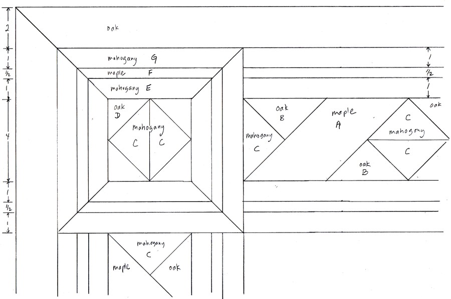 An Excel spreadsheet calculates piece sizes, based on a single input: width of strips. Overall border and corner width is 9". An oak strip is drawn on the outside of the border. There should also be a like strip on the inside of the border, before the fingerblock.