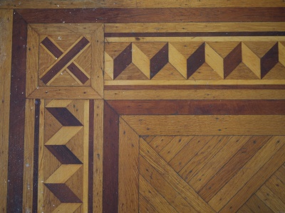 All of these have the same dimensions. All were installed during a short time stretch. Five color banded folded ribbon. Woods: walnut: 1/2", maple: 1/2", mahogany: 1", maple: 1/2", walnut: 1/2". Border width is 6". Lots of 30°/120° angles in this one. Surrounding strips are " oak, 1/2" mahogany and " oak.