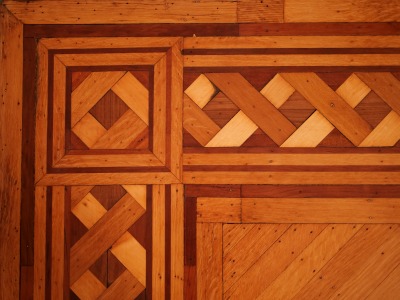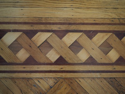 Maple pinstripes are 1/4" wide, mahogany bands are 9/16" wide. Pattern border is 6-7/8" wide. Surrounded by 1-1/2" oak, 7/8" maple, and 2" maple. Inner field is 1-1/2" slats in 9" diagonal fingerblock.