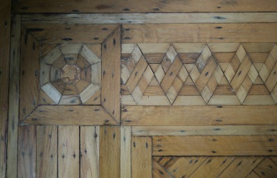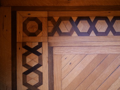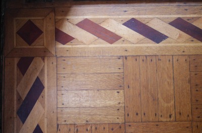 This appeared in two rooms at this house. Each ribbon is 1-1/3" wide, giving the pattern border an 8" width. The inner ribbon is 3/8" walnut and 1/2" mahogany. Surrounding strips are 3/4" oak and 1/2" maple. Inner field is 2-1/4" planks in 11-1/4" square fingerblock laid diagonally.