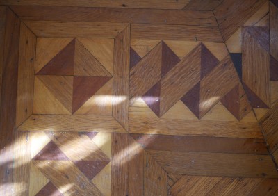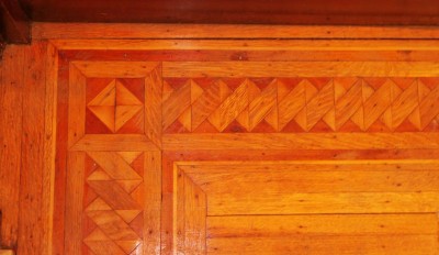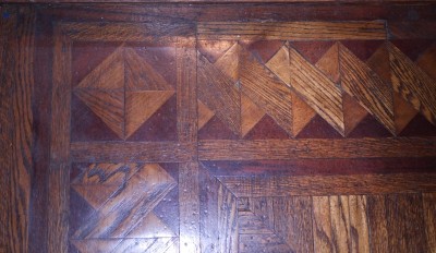 A different corner. Ribbons are 2-1/2" wide. Pattern border is 7". Surrounded by 1-1/2" oak, 1/2" mahogany, 1-3/4" oak. Inner field is 2" slats laid diagonally.