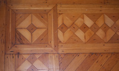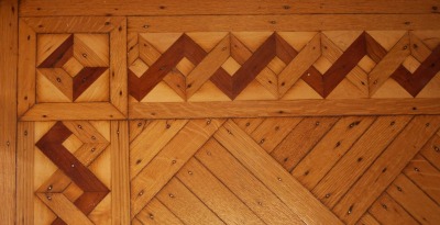 Pattern border is 7-1/2" wide. Surrounding is 1-5/8" oak, 1-3/8" mahogany and 2" oak. Inner field is 8" diagonal fingerblock with four fingers.